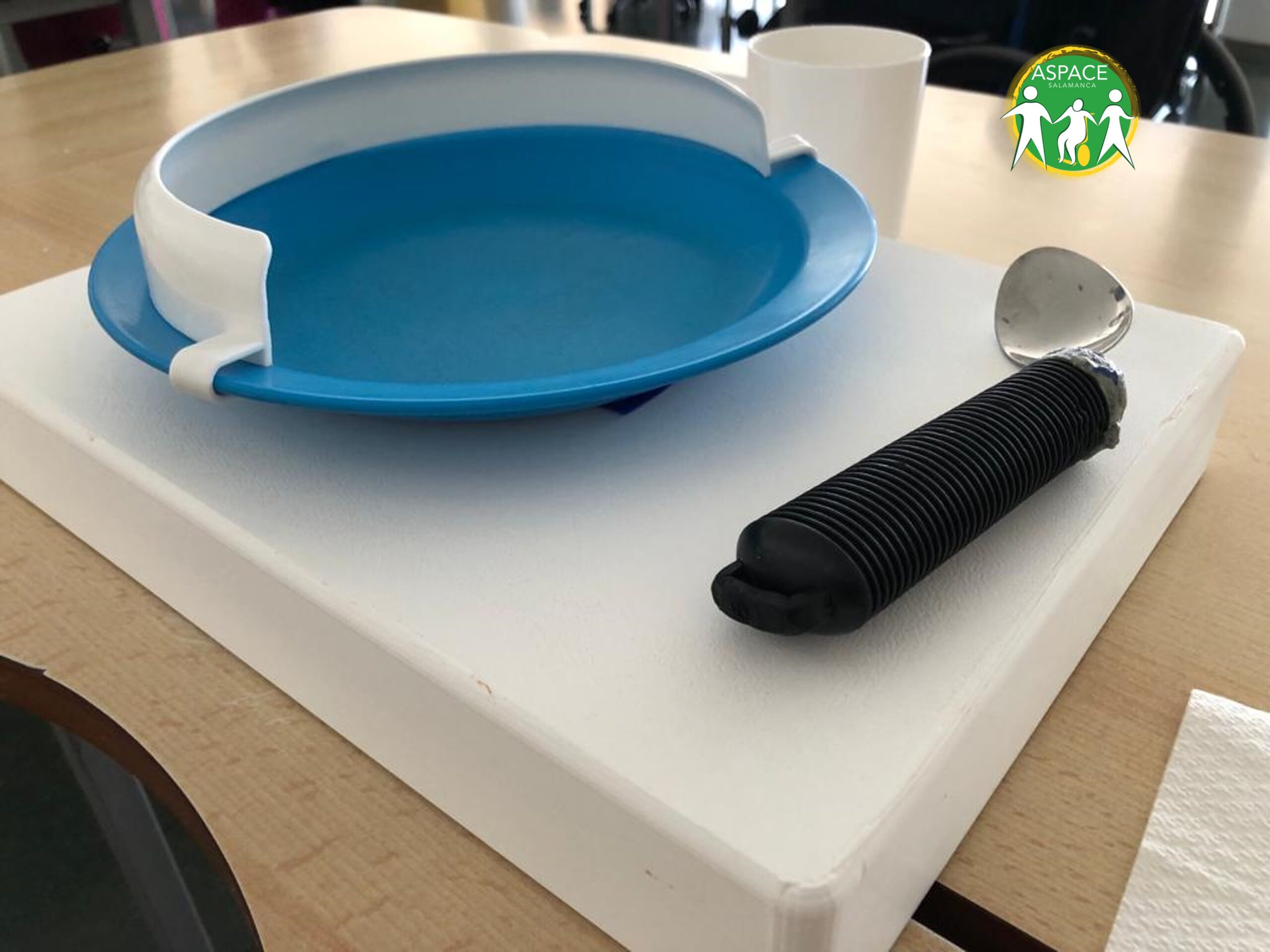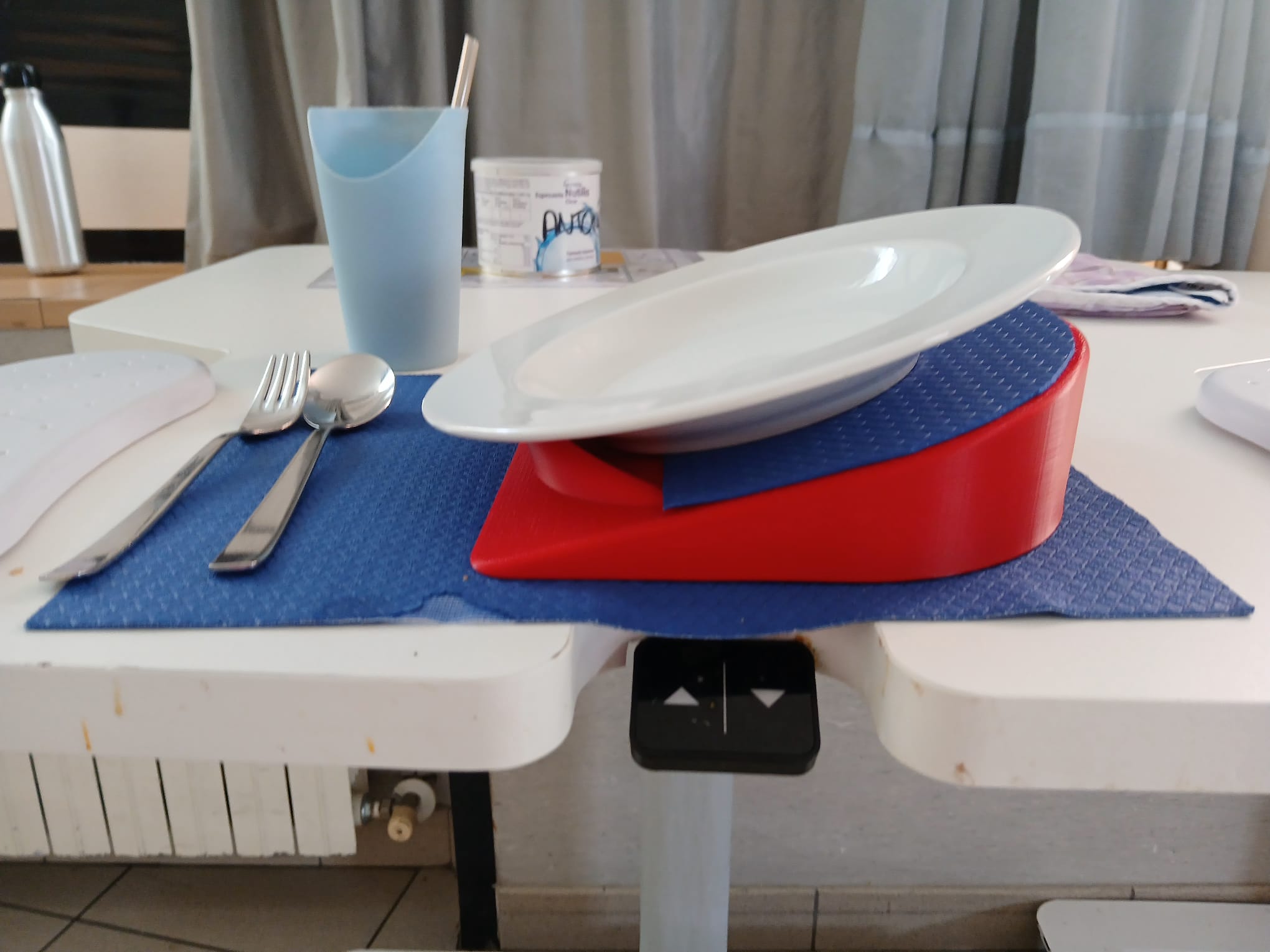 Plano inclinado para colocar el plato, al que para mejorar la adherencia y evitar el deslizamiento le hemos colocado un mantel antideslizante tanto en el plano como en la mesa.